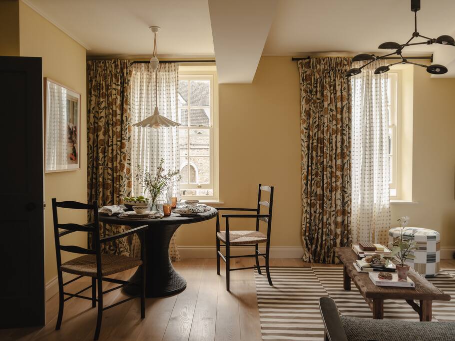 Tuppence is an exceptional one-bedroom apartment within “The Vaults” at Stow, a collection of boutique stays within a beautifully restored 18th - century former banking hall. Blending British-made craftsmanship with thoughtful, sustainable design, it’s the ideal base for couples, professionals, or solo travellers who appreciate comfort and style. Housed within a landmark Georgian building, Tuppence combines contemporary design with the warmth of Cotswold heritage. The interiors feature natural materials, soft lighting, and textures that create a calm, welcoming atmosphere. Every element has been carefully considered, from the locally made handcrafted furniture to the Hypnos Lansdowne Cashmere mattress that promises an exceptional night’s sleep. The kitchenette is equipped for light meals and morning rituals, complete with Dualit appliances, a Thomas Crapper sink, Grind coffee machine, and organic teas From Joe’s Tea Co. In the bathroom, guests will find elegant Lefroy Brooks fittings and Austin Austin organic toiletries, alongside soft towels and the gentle warmth of underfloor heating. Outside, the private roof terrace offers space to relax in the open air, with views over Stow’s rooftops, a peaceful spot for coffee, conversation, or evening drinks. Parking and an electric vehicle charger are included, ensuring convenience throughout your stay. For friends or families travelling together yet seeking privacy, there are two additional apartments available to book at The Vaults. Each offers its own private roof terrace and the same considered design and comfort, allowing you to enjoy shared time together while still having your own space to unwind. Located right in the centre of Stow-on-the-Wold, Farthing places you moments from the town’s boutiques, galleries, and dining scene, while the Cotswolds’ most iconic destinations, Daylesford, The Wild Rabbit, Soho Farmhouse and Burford are just a short drive away. We love to welcome guests of all ages, however The Vaults is designed primarily for couples and quiet stays. For this reason, we’re unable to accommodate dogs, and only babies in arms are permitted. Highlights: • One-bedroom apartment in the heart of Stow-on-the-Wold • Private roof terrace with seating • British-made Hypnos Lansdowne Cashmere mattress • Underfloor heating throughout • Lefroy Brooks bathroom fittings and Austin Austin toiletries • Kitchenette with Dualit kettle, Grind coffee machine & Joe’s Organic Tea • Locally sourced welcome basket • Private parking and EV charging • Perfect for couples, professionals, friends and weekend escapes